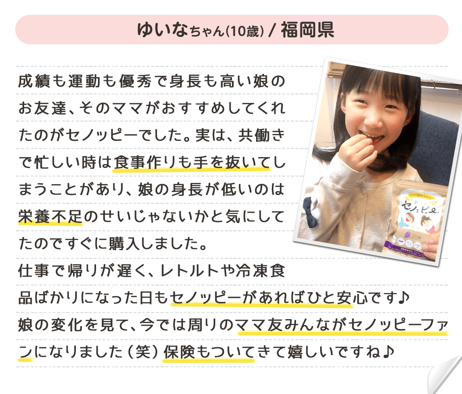 食事だけで成長期に必要な栄養素を摂るのは難しいから、「セノッピー」の力を借りるのは効率的な手段なんですね!